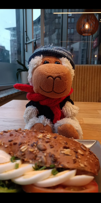 Ich bin heute zum Bummeln in der Stadt. Es sind viele Leute unterwegs,die Fußgängerzone ist ganz schön voll. Deshalb habe ich mich erstmal beim Bäcker hingesetzt und mir dieses große Brötchen gegönnt. Mmmhh mit Ei und Majo ,voll lecker. Meine Spielerin besorgt mir gerade einen warmen Kakao.