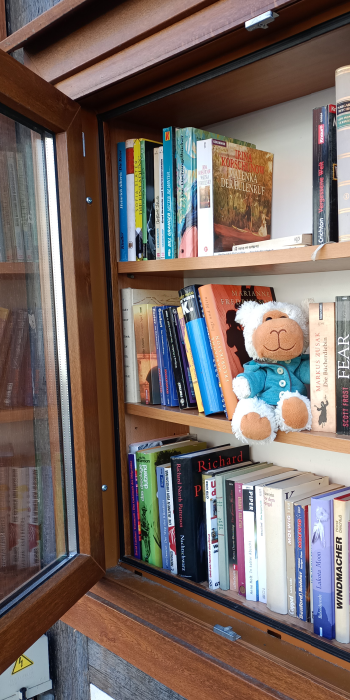Hier hat man einen schönen Überblick und kann ungestört lesen. Es sei denn jemand macht frische Luft und will ein Buch ausleihen. Dann wird’s zugig 🙂