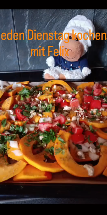 Dazu den Kürbis entkernen und in Scheiben schneiden und aufs Backblech legen.Zwiebeln und Tomaten würfeln und auf den Kürbis verteilen. Cashewnüsse und Petersilie hacken und darüber geben.