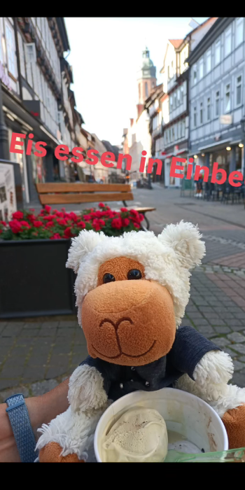 Gestern bin ich mit meiner Spielerin nach Einbeck gegangen, das sind so 10 Kilometer. Also sie ist gegangen und ich habe es mir in ihrem Rucksack gemütlich gemacht 😊. Ich habe auf dem Weg viel gesehen, Kartoffelfelder und Getreide so weit das Auge reicht. Einen Glückstaler habe ich auch gefunden. Der kommt in meine Spardose. In Einbeck traf ich Micky Maus und Donald Duck,dann ging es weiter in die Innenstadt. Auf dem Marktplatz war viel los ,denn am Mittwoch ist immer Wochenmarkt. Für mich gab es ein Eis, mmmhh lecker. Danach habe ich meinen Kameramann von der Arbeit abgeholt und wir sind mit dem Auto nach Hause gefahren. Das war ein toller Tag.