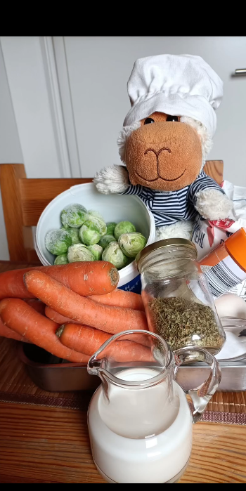 Heute gibt es zum Mittagessen nur etwas Leichtes, einen Rosenkohl-Möhren Auflauf.